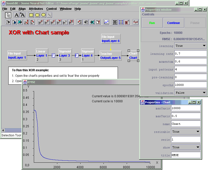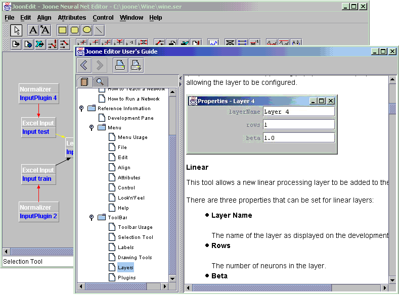 The GUI editor is a graphical user interface to visually create, modify and train a neural net. It's based on a graphical framework called JHotDraw , an other SourceForge project (Thanks to the authors of that package).